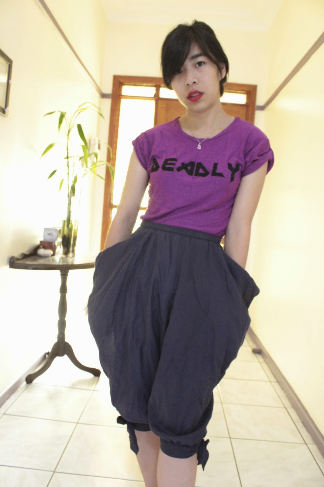 Admittedly, this post has nothing to do with game 'Words with Friends'. I'm not sure if you have noticed but words are creeping into wardrobes as of late; whether that be quirky puns like the picture below or just something expressive and articulate like the picture above. I know that everyone views fashion differently but for me, I see it as a projection of my mood, personality and it provides me with great joy (part of the reason why I love shopping). So when I see tops or jumpers that have something written that I can relate to then I have no shame wearing them. Take for example the Shona Joy outfit that I wearing, Shona top and Shona joy St Lucia- pirate style shorts. Because the top colour is such a strong purple, I wanted to continue with that strong image by pairing it with my pirate shorts which also happen to work nicely in terms of colour coordination as well. Finally to top it off, a bold lip and for those curious I use MAC Ruby Woo. NB picture on the right is me making the pirate 'arghh' sound.